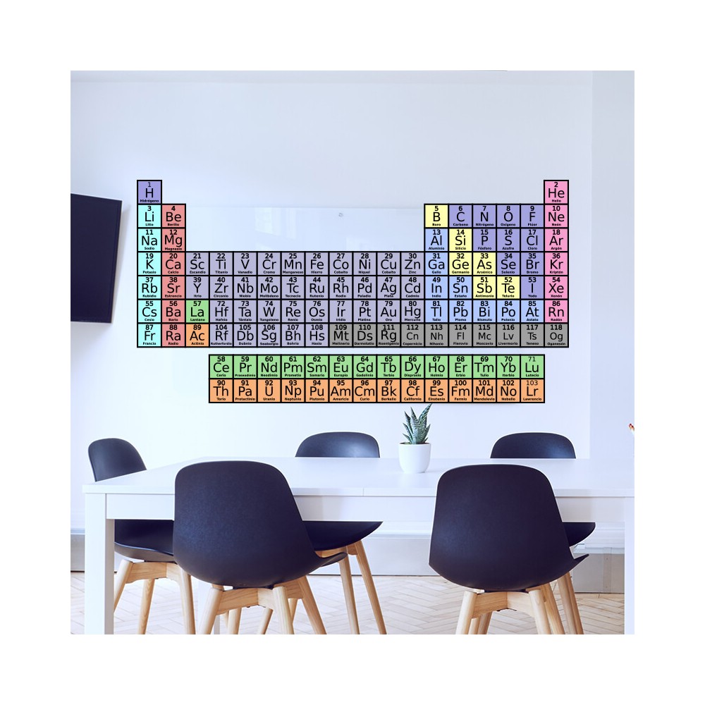 Vinilo educativo de una completa tabla periódica de los elementos donde aparecen todos los elementos químicos ordenados por números y sus propiedades. Con este gran vinilo de la tabla periódica elementos en la pared podrás repasar la tabla sin problemas con los compañeros de tu clase. Ideal también para colegios y laboratorios. En Español
