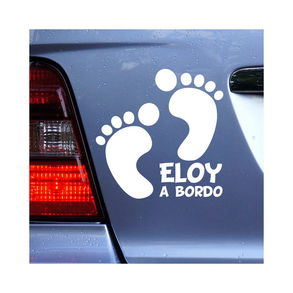 Advierte a otros conductores que vayan con más cuidado con esta pegatina bebé a bordo personalizable con el nombre que quieras. Se acompaña con 2 pequeñas huellas en un diseño bonito y simpático.