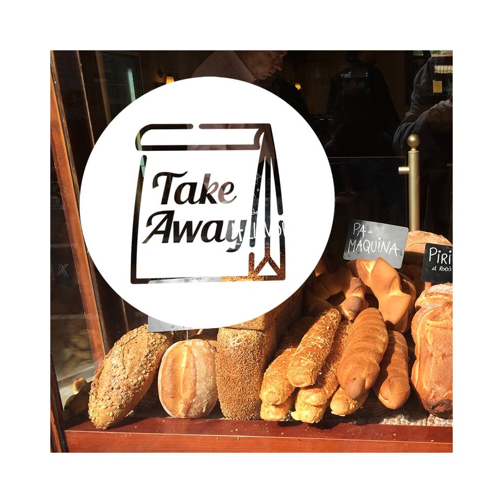 Llama la atención de tus potenciales clientes con este vinilo take away (para llevar) con forma circular. Una manera eficiente de poner una señal e indicarles a tus clientes que lo que preparas, se puede para llevar, ya sea un sándwich o un café.