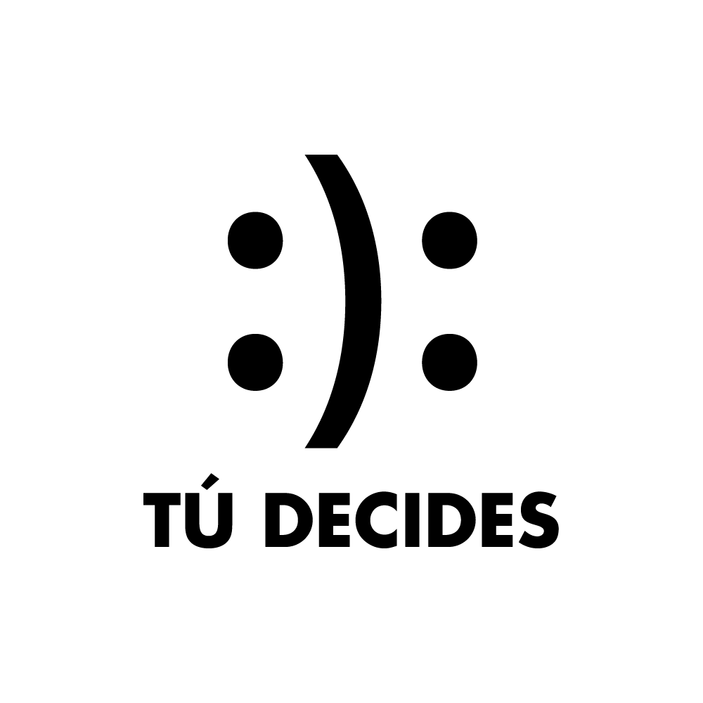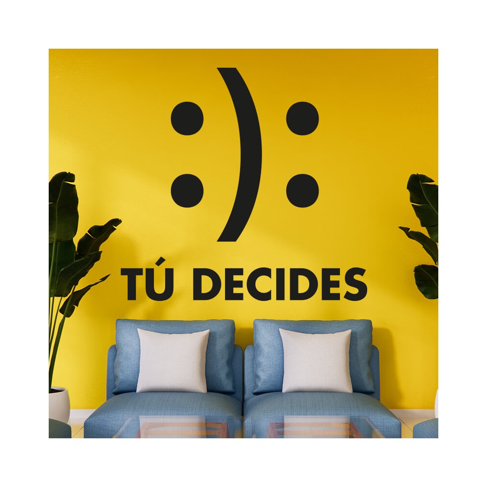 La vida es cuestión de actitud. Un vinilo con la frase tú decides, con una cara doble alegre y triste. Con este vinilo tú decides, dejas claro que en la vida, depende como afrontemos las problemas, eres de un lado o de otro. Vinilo de frase muy potente y motivadora.