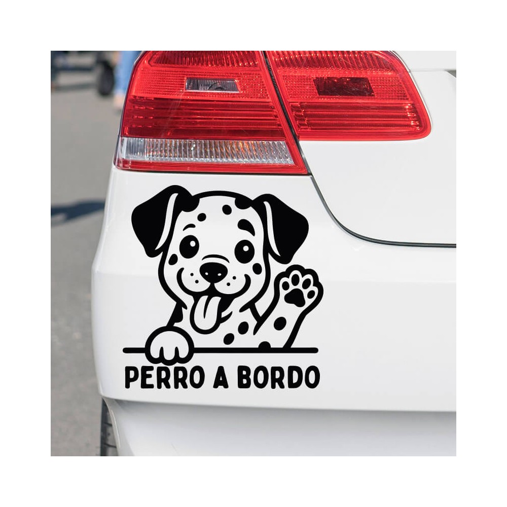 La pegatina Perro a Bordo Dálmata es ideal para los amantes de esta raza tan carismática y para quienes viajan habitualmente con su mascota. Un vinilo decorativo para coche que avisa al resto de conductores de la presencia de tu perro, aportando seguridad y un toque personal y original a tu vehículo.